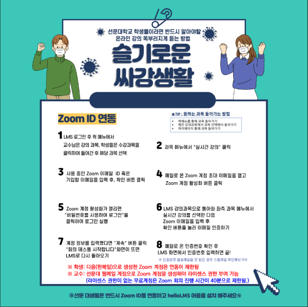 확인하시고 3.2.(화) 개강 전까지 e-강의동에 Zoom ID 연동을 하셔야 수업 접속 및 출석 정보 연계가 가능함을 알려드립니다.